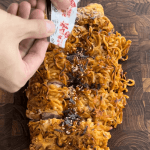 불닭오믈렛 레시피를 완성한 모습. 불닭볶음면과 계란이 함께 노릇하게 구워져서 붉은색과 노란색이 뒤섞여 있다. 그위로 검은색 김가루가 뿌려지고 있다.