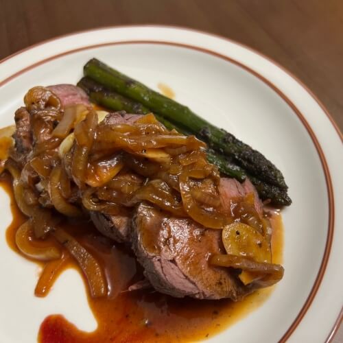 A1 스테이크 소스 맛있게 만들기를 완성한 모습. 안심스테이크위로 완성한 A1스테이크소스가 올라가 있다.