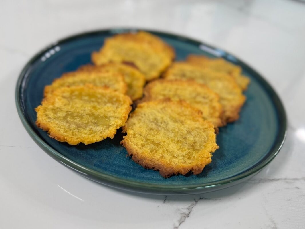 140도로 예열한 에어프라이어 또는 오븐에 반죽을 넣고 40분간 굽습니다. 다 구워진 반죽을 완전히 식혀주면 바삭바삭한 고구마 칩 완성이에요.